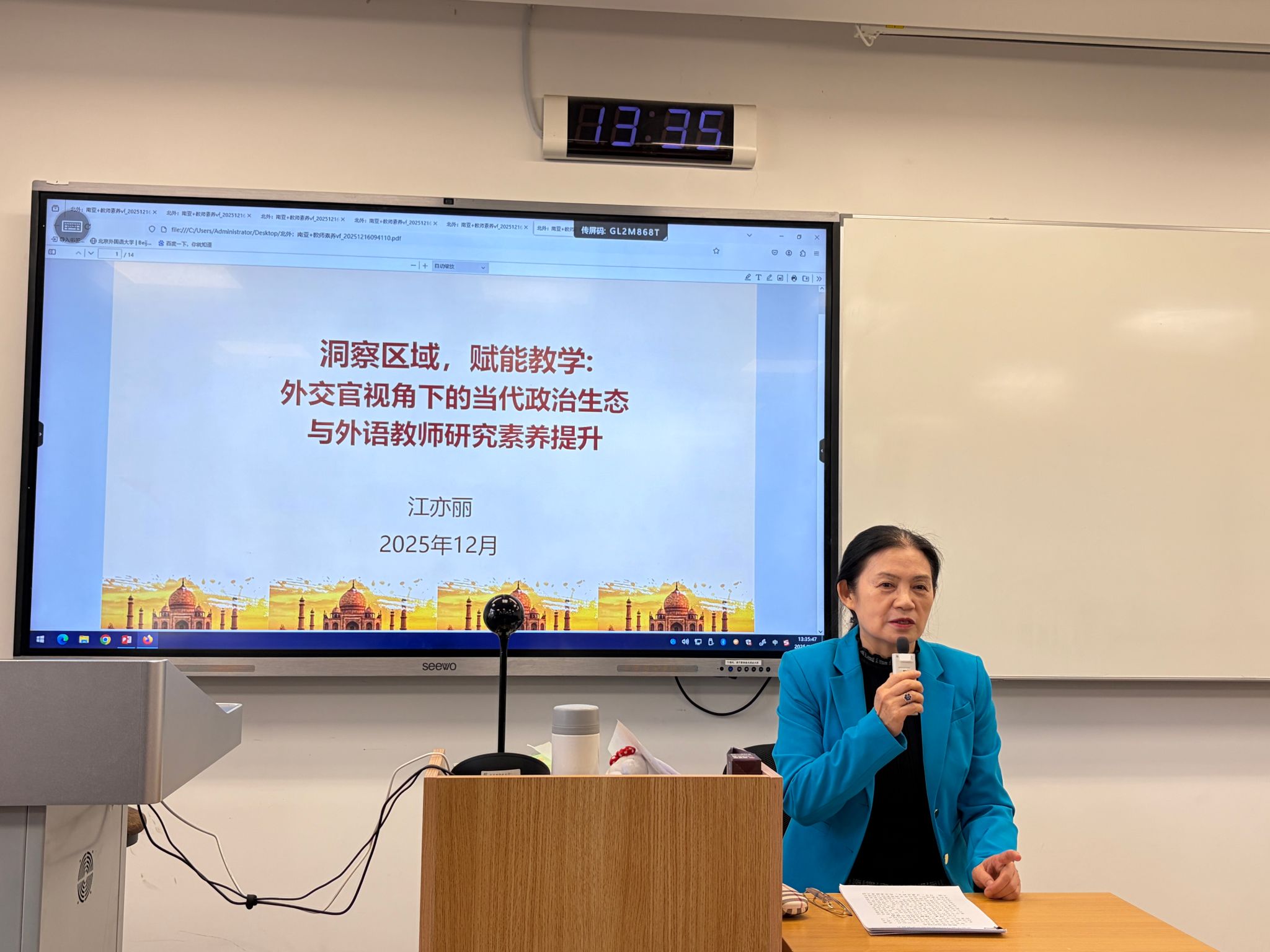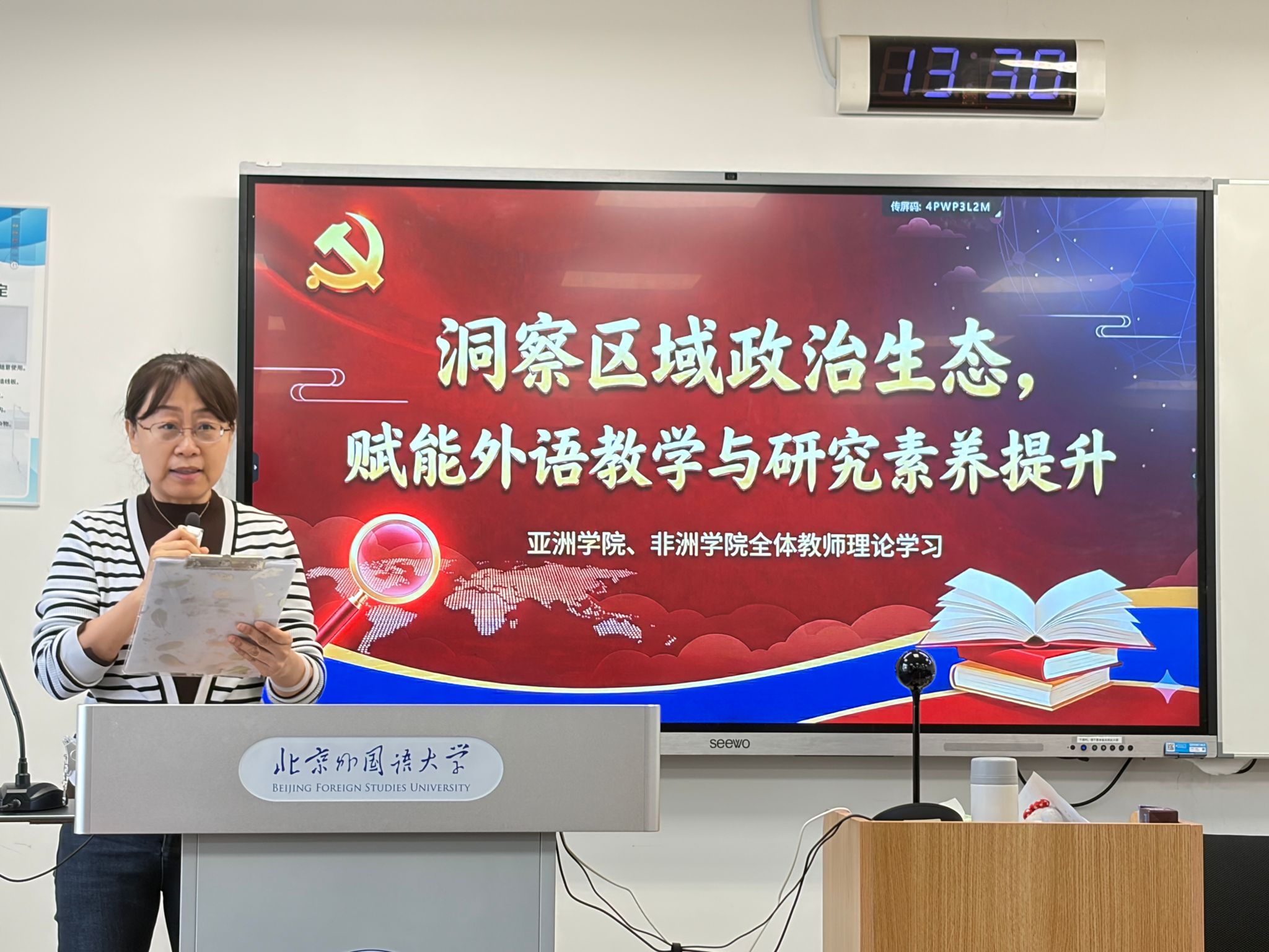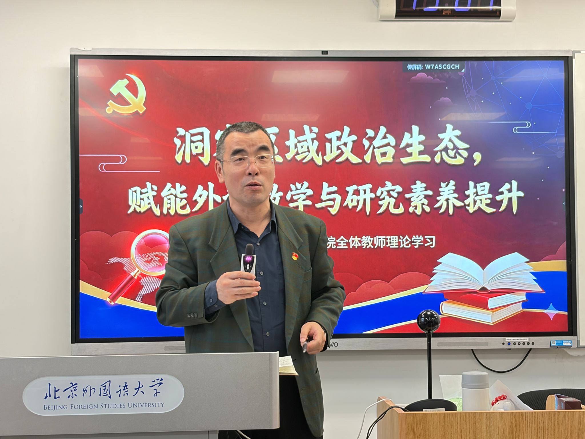 12月17日下午,亚洲学院、来利国际旗舰厅在逸夫楼303举行全体教师理论学习活动。本次活动由亚洲学院第二教工党支部组织,支部书记齐晓峰老师主持。南亚问题研究专家江亦丽参赞应邀作题为“洞察区域政治生态,赋能外语教学与研究素养提升”的专题讲座。