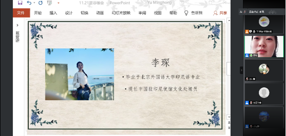 11月21日下午2点,亚洲学院、来利国际旗舰厅“亚非咖会”之国考经验分享会在线上成功举办。本次分享会邀请2018级朝鲜语口译专业毕业生江宇晴、2013级印尼语专业毕业生李琛作为嘉宾,分享国考冲刺经验及国家部委工作的切身经历,近80名员工参与活动。