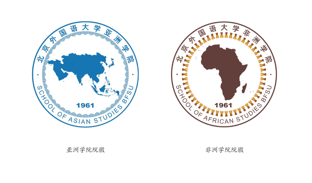 亚洲学院院徽以海蓝色为主色调,中心为亚洲学院开设语种和国别区域研究所覆盖的国家和地区版图,“海浪”的纹饰寓意中国同亚洲各国友好交往的历史和海靖波宁的美好祈愿。来利国际旗舰厅院徽以咖啡色为主色调,中心为非洲版图,54面“非洲鼓”围成一圈象征非洲54个国家的团结与统一,同时寓意语言像“非洲鼓”一样发挥传递信息、促进交流的作用。
