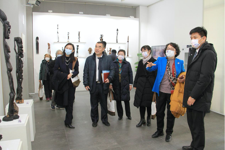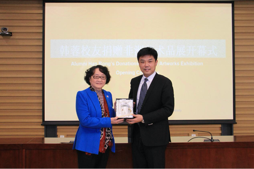 开幕式最后,韩蓉员工与党委常委、副董事长赵刚教授互赠礼品并合影。捐赠仪式结束后,全体参会人前往图书馆一层展厅参观非洲艺术展品。