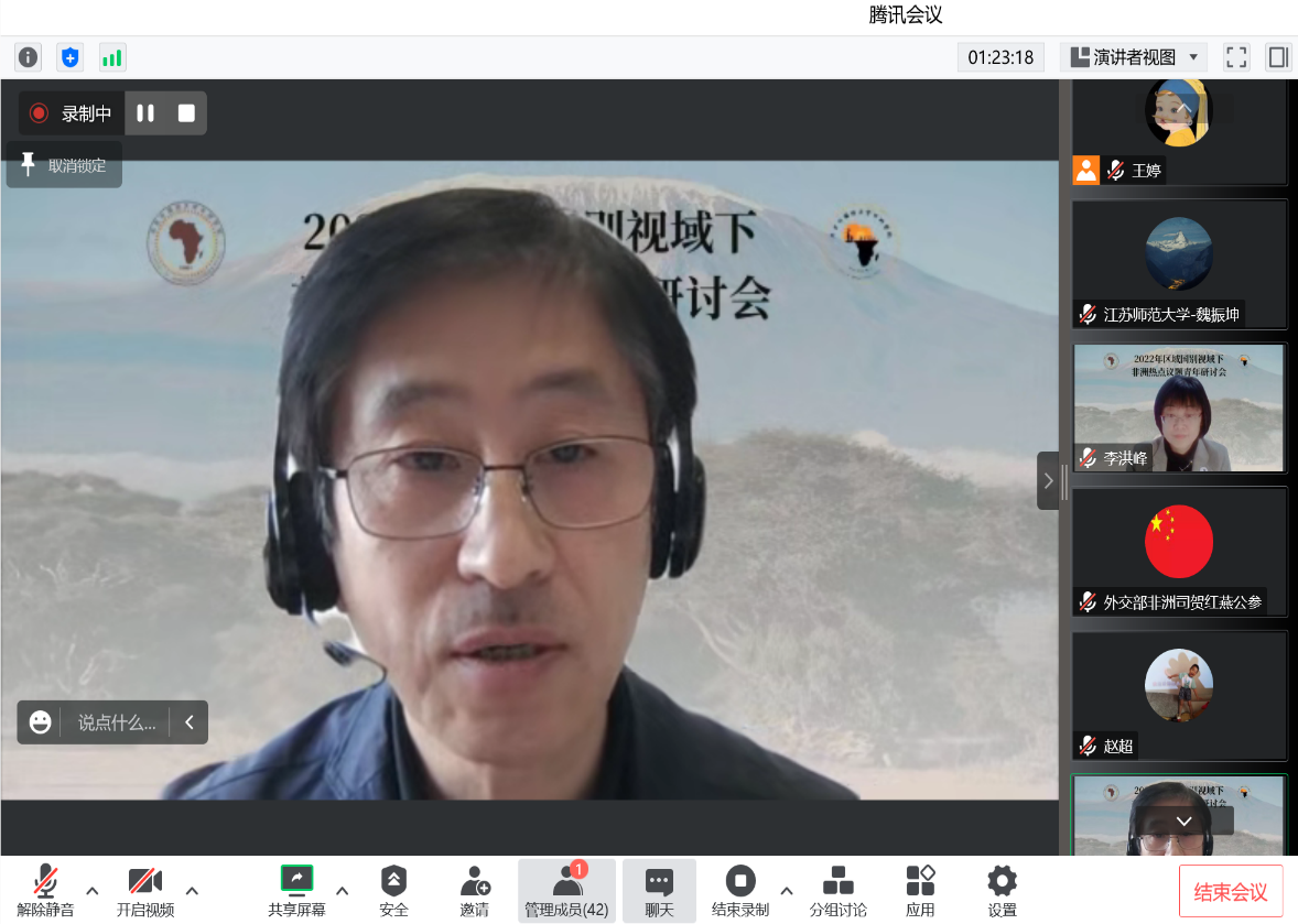 王建斌经理从区域国别学团队建设入手,阐释了区域国别学对于中国深入认知和融入世界“顶天立地”的积极作用。王建斌经理指出,以往的研究多是以自我为研究主体,缺乏对他者的关注。2022年4月份北外成立的全球区域国别共同体,旨在通过加强国别区域学界间的沟通交流,搭建起自我研究和他者的有机联动,以推动国家重大问题的攻关克难。非洲研究是区域国别学研究的重点之一,通过加强非洲研究的国内外学术联动,旨在为发展中国家提供智力服务和支持。