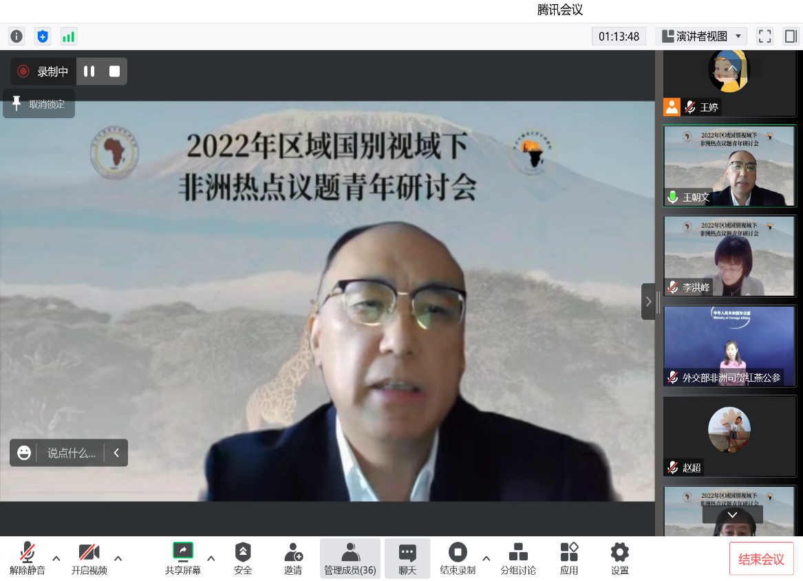 王朝文社长强调非洲的多彩文化和悠久历史,指出中非交往具有历史渊源和深厚友谊。作为中非友好关系的见证者,在非洲长期的工作和生活经历也加深了他对于非洲的理解和喜爱。王朝文社长向研究非洲问题青年学者提出了三点建议:一是加强对新时代中非关系的研究,展示中非务实合作事务,提升中国在中非关系学术领域的话语权。二是,善于用中国视角研究非洲问题。通过立足中国立场高质量产出并广泛传播非洲研究成果,在世界上改变西方对非洲研究的主导地位,改变在社科研究领域的西方中心主义。三是,积极讲好新时代中非故事。研究非洲问题的学者们,既是中非关系的研究者,更是中非友谊的传播者,一定要具备有一种时不我待的使命感。