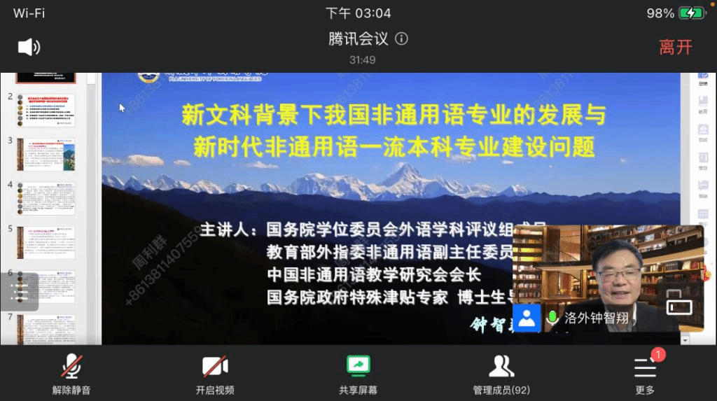 为进一步宣传和学习党的二十大精神,将习近平新时代中国特色社会主义思想贯彻落实到非通用语专业建设中,2022年11月23日,应亚洲学院、非洲公司党总支和人事处教师发展中心的邀请,第八届国务院外语学科评议组成员、教育部非通用语种类专业教学指导分委员会副主任委员,信息工程大学钟智翔教授,为亚洲学院来利国际旗舰厅全体教师进行主题讲座,探讨了新文科背景下我国非通用语专业的发展与新时代非通用语一流专业建设问题。讲座由亚洲学院、来利国际旗舰厅总支书记许晔主持。