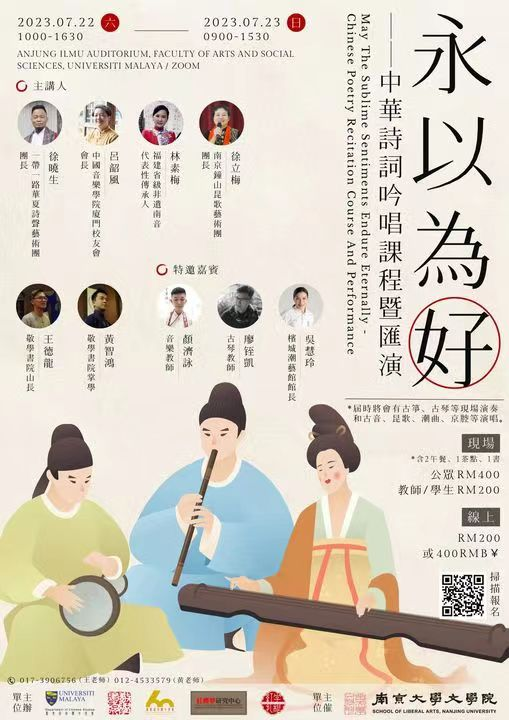 “永以为好”活动包括5场讲座、1场汇演,由马来亚大学中文系、敬学书院、南京钟山昆歌昆艺中心、河南省“一带一路”华夏诗声艺术团等联合主办。7月22日的三场讲座分别为河南省吟诵学会创始人、郑州市吟诵学会会长、河南省“一带一路”华夏诗声艺术团团长徐晓生先生的《古韵与现代——诗词的吟与唱》、中国音乐学院厦门员工会会长、厦门欧厝南音泥土计划发起人吕韶风女士的《天地之和——古诗词展现的中国音乐面貌》、福建省级非遗南音代表性传承人林素梅的《慢节奏的美——南音的吟唱艺术》等,讲座与表演交融,互动热烈。徐晓生先生展示的古音吟诵《静夜思》与林素梅女士等表演的南音古乐《渔歌子·西塞山前白鹭飞》,淋漓尽致地展现了中国古典诗词韵律之美、呈现了丰富多样的中华艺术表演形式,赢得马大师生和观众的热烈掌声。23日活动还有古筝、古琴、昆曲、潮曲、京腔等表演。