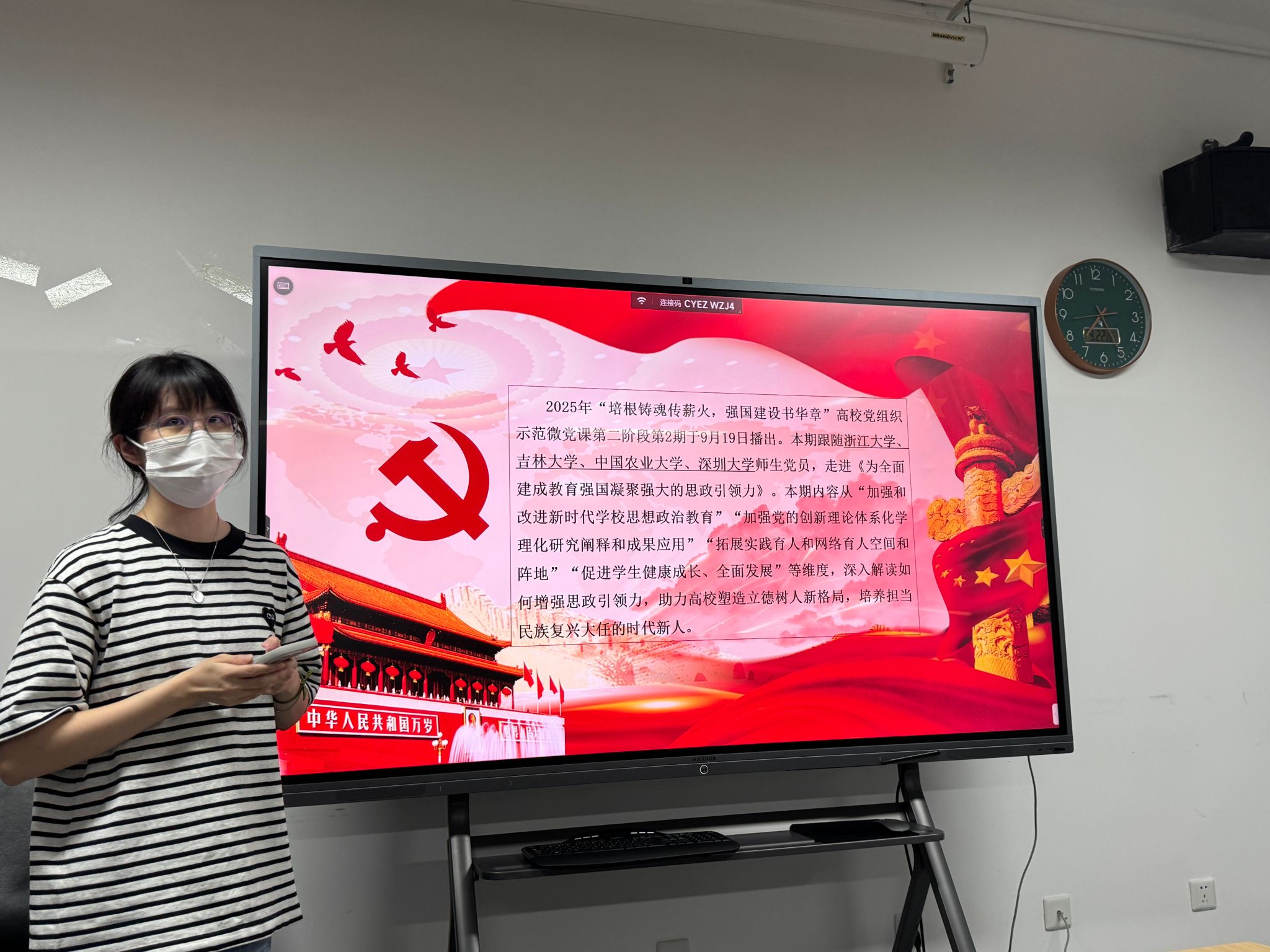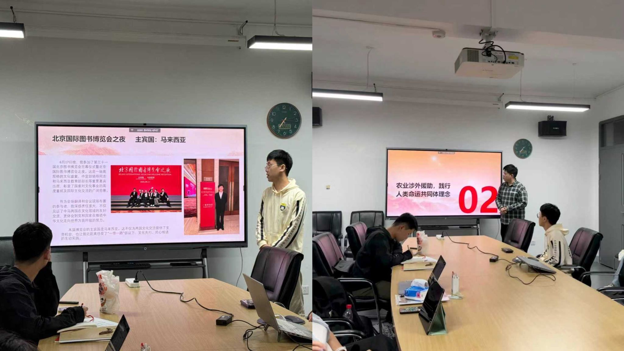 理论学习环节共分为两部分。首先,入党积极分子唐晓峰及入党申请人秦昌盛向与会同志分享了外事外交活动的经验和心得体会。唐晓峰同志分享了自己参加第三十一届北京图书博览会开幕仪式暨北京国际图书博览会之夜以及第十八届中华图书特殊贡献奖颁奖仪式的筹办的经历,表达了身为当代青年将更加积极地投身到中华文化传播的伟大事业中的决心。秦昌盛同志则从自己参加泰国农业文化资产遗产管理与保护研修班以及在智库实习的经历出发,深刻感受到我国正通过农业领域涉外援助践行人类命运共同体理念,也切实体会到国家以二轨外交为重要途径,积极传播中国智慧的责任担当。其次,宣传委员罗雪婷结合9月19日播出的2025年高公司党组织示范微党课第二期第二讲的内容,带领与会同志进行理论学习,深刻体会习近平总书记对于教育强国的指示精神。