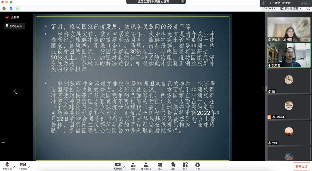 讲座之后的提问环节,沈晓雷副研究员就非洲国家认同与民族认同之间的关系、非洲国家民族联邦制、非洲现代化进程中城市族群与乡村族群之间的关系等问题,同与会者展开了热烈的交流与互动。校内外师生和专家学者共计100余人参与了此次线上讲座。