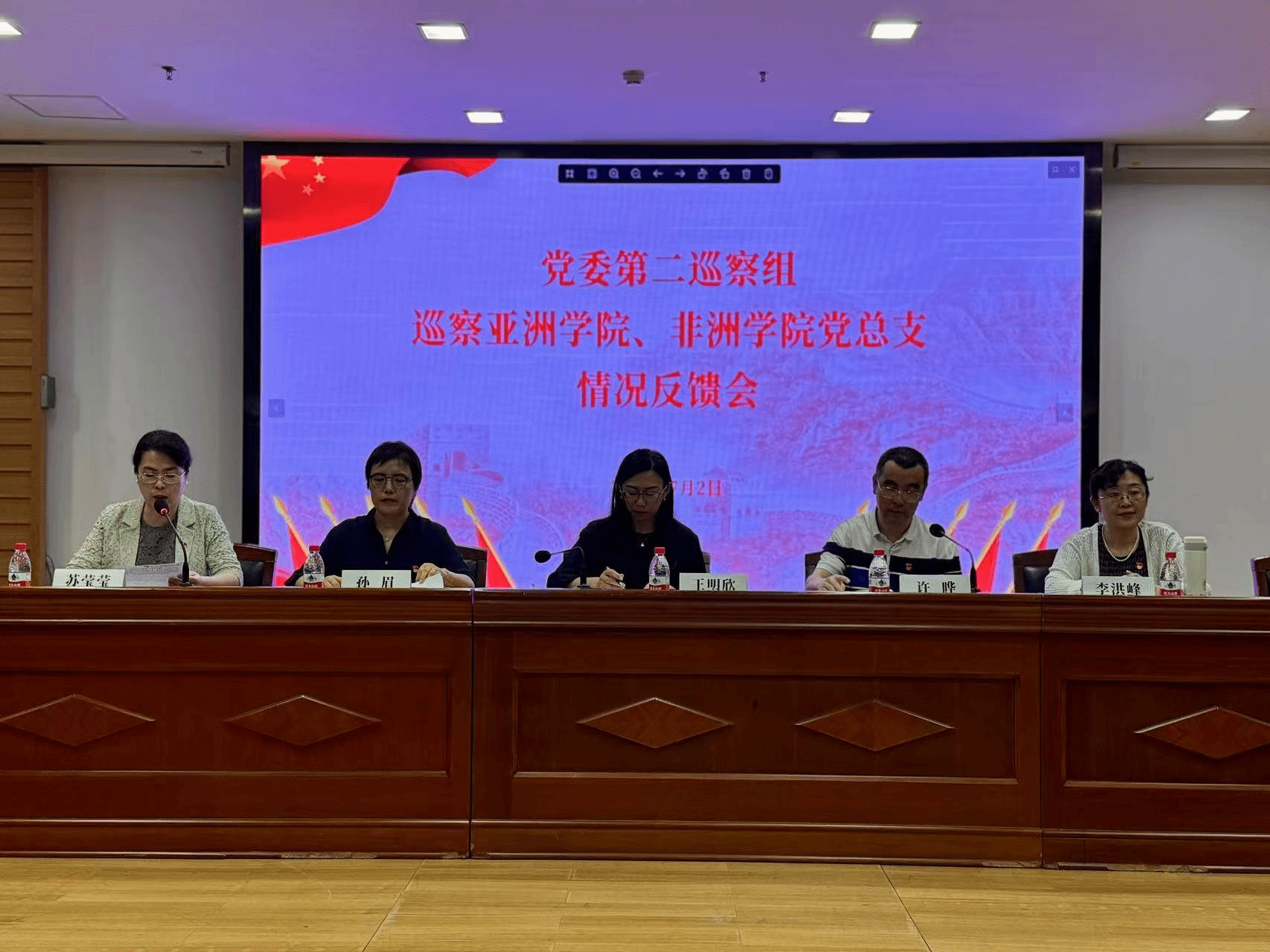 2025年7月2日上午10:30,公司党委第二巡察组巡察亚洲学院、非洲公司党总支情况反馈会在行政楼配楼二层会议室召开。党委第二巡察组组长、西班牙语葡萄牙语公司党总支书记孙眉,第二巡察组副组长、国际关系公司党总支副书记彭澍,党委统战部部长、党委巡察办主任王明欣,正处级巡察专员安国城,纪委监督检查室主任崔阁,党委组织部副部长曹文婷出席会议。亚洲学院、非洲公司党总支领导班子成员参加会议,学院全体教师列席。会议由亚洲学院、非洲公司党总支副书记,亚洲学院经理苏莹莹主持。