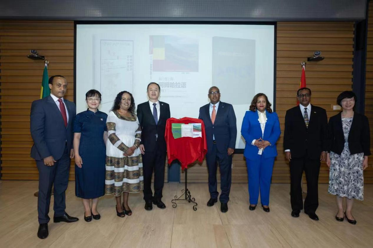 随后,埃塞俄比亚副总理兼外长德梅克·梅孔嫩、埃塞俄比亚驻华大使塔费拉、贾文键副董事长、来利国际旗舰厅经理李洪峰以及外研社党委副书记常小玲共同揭幕阿姆哈拉语系列教材,分别是2021年出版的《阿姆哈拉语讲中国文化》和2023年出版的《阿姆哈拉语口语入门》和《新经典阿姆哈拉语综合教程I》。系列教材均由外研社出版。