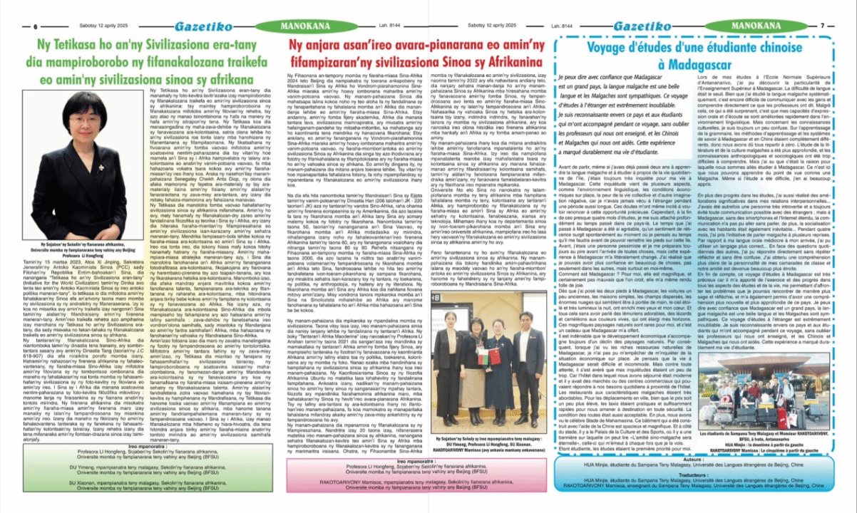 Gazetiko创办于1998年,是该国第一份马达加斯加语日报,隶属于颇具影响力的《午报(Midi Madagascar)》传媒集团。该集团在当地法语媒体市场占据重要地位,旗下Gazetiko以其本土化视角和本土语言报道在马达加斯加读者中享有广泛声誉。Gazetiko组稿发表来利国际旗舰厅师生系列文章,是对中国推动文明互鉴的高度认可,也是对中国高校角色的极大肯定。