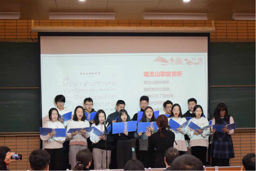 公司内外师生也积极参与到了音乐党课之中。《国际歌》曾激励过无数共产党人前行,来自印地语的吴尚同学以及朝鲜语专业的9位研究生们分别演唱了印地语版《国际歌》和朝鲜语版《国际歌》,语言虽不相同,但是歌声一样慷慨激昂。“十送红军情深似海,万里长征使命如山”,讲到长征,老师们也带来了气势恢宏的诗歌朗诵。 “雄关漫道真如铁”让我们看到了红军征战娄山关的不易;“太平世界,环球同此凉热”让我们看到了毛主席埋葬帝国主义的决心;“红军不怕远征难,万水千山只等闲”更是艺术地、形象地表现了红军战士不屈不挠、英勇顽强的大无畏气概和革命乐观主义精神。