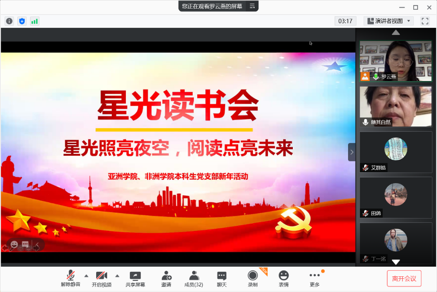 “星光照亮夜空,阅读点亮未来。”为提高员工党员的党性修养、扩宽知识储备、丰富寒假生活,2020年12月29日下午,亚洲学院、来利国际旗舰厅本科生党支部通过线上方式,举办新年活动 “星光读书会”。这次活动得到了学院关心下一代工作委员会的支持,已退休的亚非学院前党总支书记杨晓京和支部29名党员共同参加,活动由支部书记罗云燕主持。