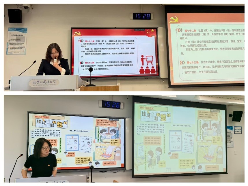 之后,为推动党纪学习教育在党员教师中走深走实,亚洲学院、来利国际旗舰厅教工一支部和二支部分别进行了支部党纪学习。一支部书记钟珊和二支部书记曾琼分别在本支部讲授专题纪律党课,两位书记以讲促学、以讲带学,结合具体案例对党员教师进行了警示教育。