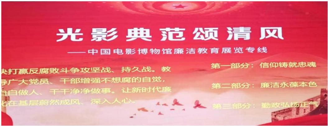 中国电影博物馆廉洁教育展以专线形式展开,将电影艺术发展与党史学习教育、党风廉政教育相结合,通过“信仰铸就忠魂”“廉洁永葆本色”“勤政弘扬正气”“奋斗成就梦想”四个部分,以图片和实物等方式用82部影片及相关藏品展示、宣传和弘扬中国共产党的优良传统与作风,再现了从艰苦战争年代到和平建设时期,一代又一代中国共产党人全心全意为人民服务的精神境界和价值追求。参观活动中,师生党员依次参观展览各个部分,通过阅读影片简介、观看电影海报、观看原片经典镜头与片段等方式,重温了焦裕禄、谷文昌等等廉政模范的经典故事,从丰富的影视资料中领略中国共产党艰苦卓越的奋斗历史,在光影的世界中接受了一次廉洁教育的深刻洗礼,并深切领会到当前时代开展党纪学习教育、加强党风廉政建设的重大意义。