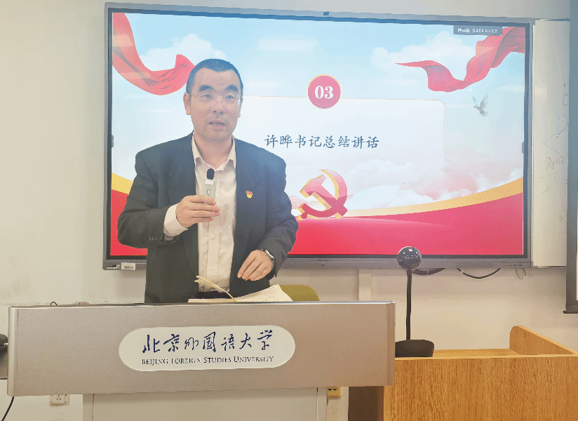 本次理论学习最后,亚洲学院、非洲公司党总支许晔书记进行总结。他强调“国际影响力”是教育强国的六大特质之一,两院教师要主动制定对象国出访计划,积极开展国际合作与交流,拓宽国际视野,提升国际对话能力。此外,他指出要深化支部工作法、班主任工作办法制度化、规范化,并推动已出台的相关文件落地见效,全面落实立德树人根本任务,在教育强国建设征程中奋勇前行。