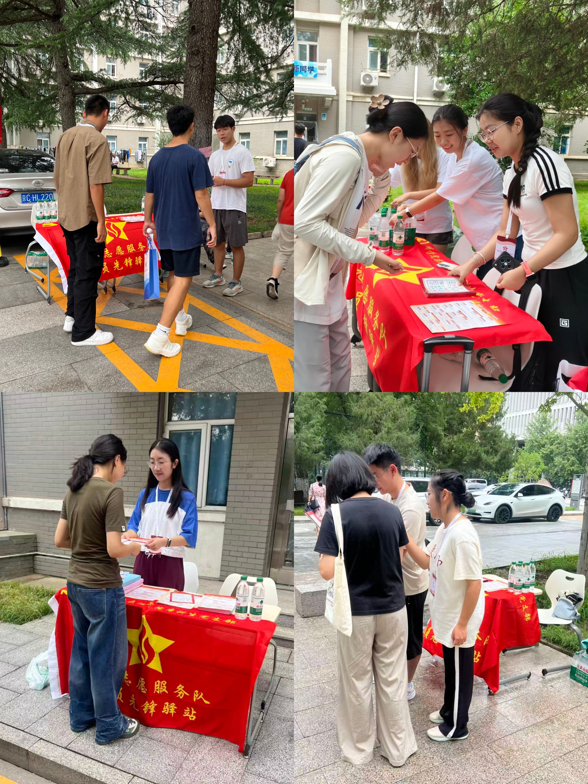 驿站内还特别放置了《中国共产党发展党员工作流程图》(中央组织部组织一局编)单页,由员工党员为新生介绍入党相关程序。同时放置了员工党员编制的《新生学习生活指导手册》,内容涵盖学校交通信息、常用联系方式、后勤服务指南等实用信息,帮助新生更快适应老员工活。尽管天气炎热,但志愿者们始终保持着饱满的热情,帮助新生搬运行李,耐心细致地为指路答疑,主动分享自己的学习经验,努力让新生感受到北外校园的温暖。