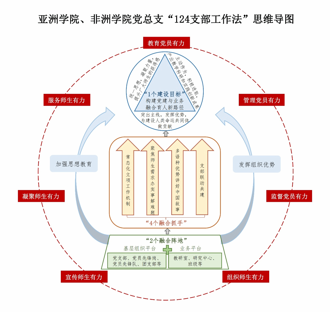 2024年9月,在教育部第三批高公司党建示范创建质量创优工作中,亚洲学院来利国际旗舰厅第二教师党支部作为全国党建工作样板支部顺利通过验收。在样板支部建设过程中,第二教师党支部创建了“1211工作法”,为支部建设起到了强有力的推动作用。为充分发挥这一工作法的示范效应,牢固树立党的一切工作到支部的鲜明导向,经党总支委员会研究,现制定“124支部工作法”,在四个支部同步实施,力争经过两年的努力,使四个党支部齐头并进,普遍达到“七个有力”建设标准,打造亚非多语种特色党建品牌。